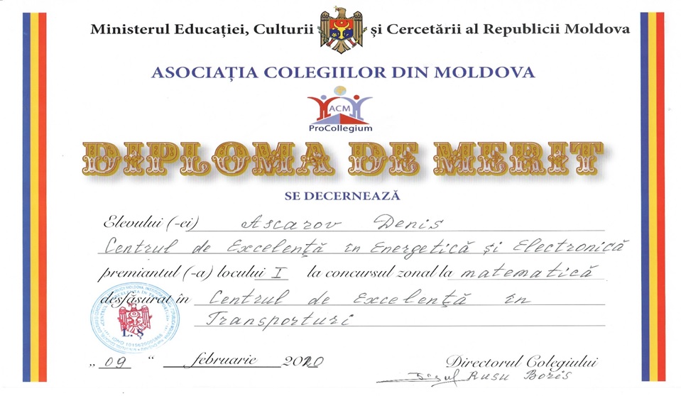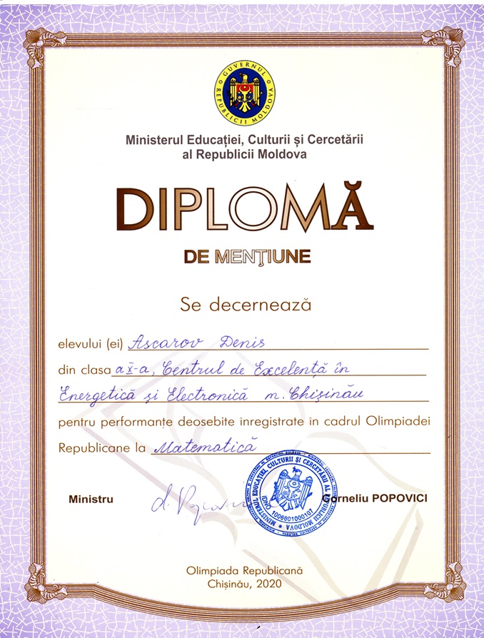 Olimpiada Republicană la Matematică, ediția a 64-a, Chișinău, 28 februarie-02 martie 2020: Mențiune, Ascarov Denis, grupa C-0219, profesor Gîsca Radu