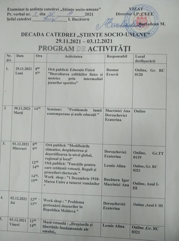 | 1. | Bucătaru Igor | Istoria/Filozofia | Studii superioare. USM 1990 | Superior,2020 | 31 | 09.11.2019-29.11.2019 IFC | 2022 |